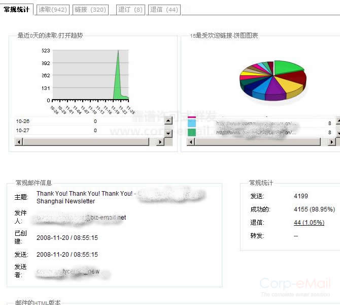 靠谱许可式邮件平台可以对群发的邮件点击分析、打开次数分析和转发分析,并且可以查看html邮件的链接点击分析。
